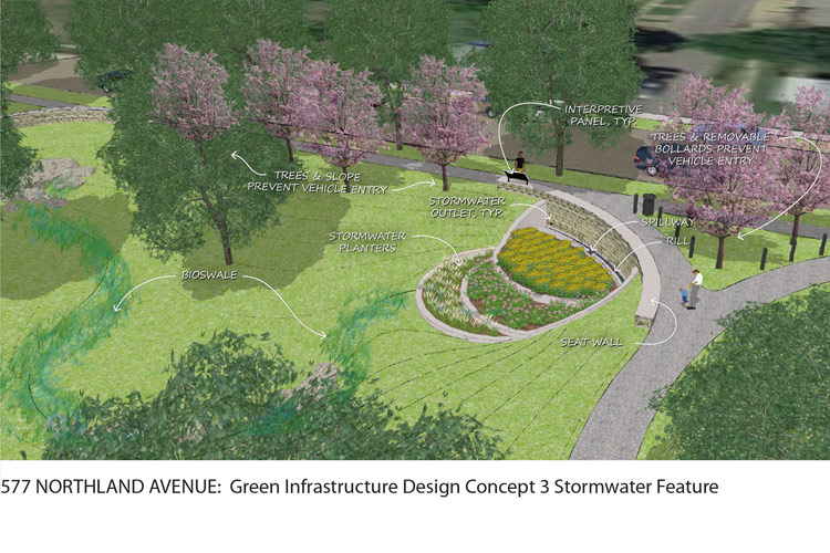 Today, the Northland Corridor is located in a walkable neighborhood featuring a mix of small businesses, public schools, churches and other community organizations. As part of this large-scale development project, Buffalo Sewer is developing community green spaces that promote walkability and manage stormwater. Design concepts for the project include tree plantings, stormwater planters, and other installations that will enhance the development with attractive landscaping and reduce stormwater runoff into the sewer system.